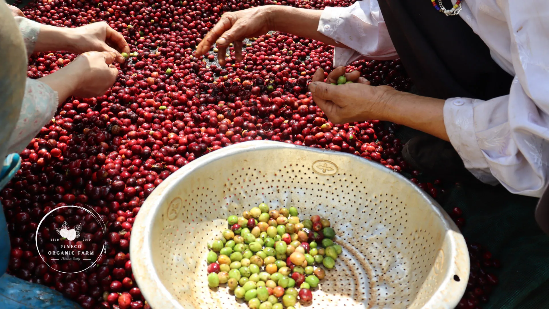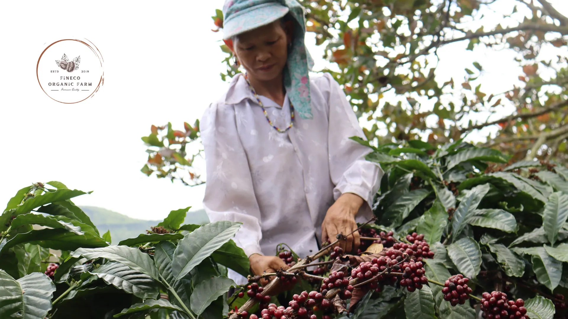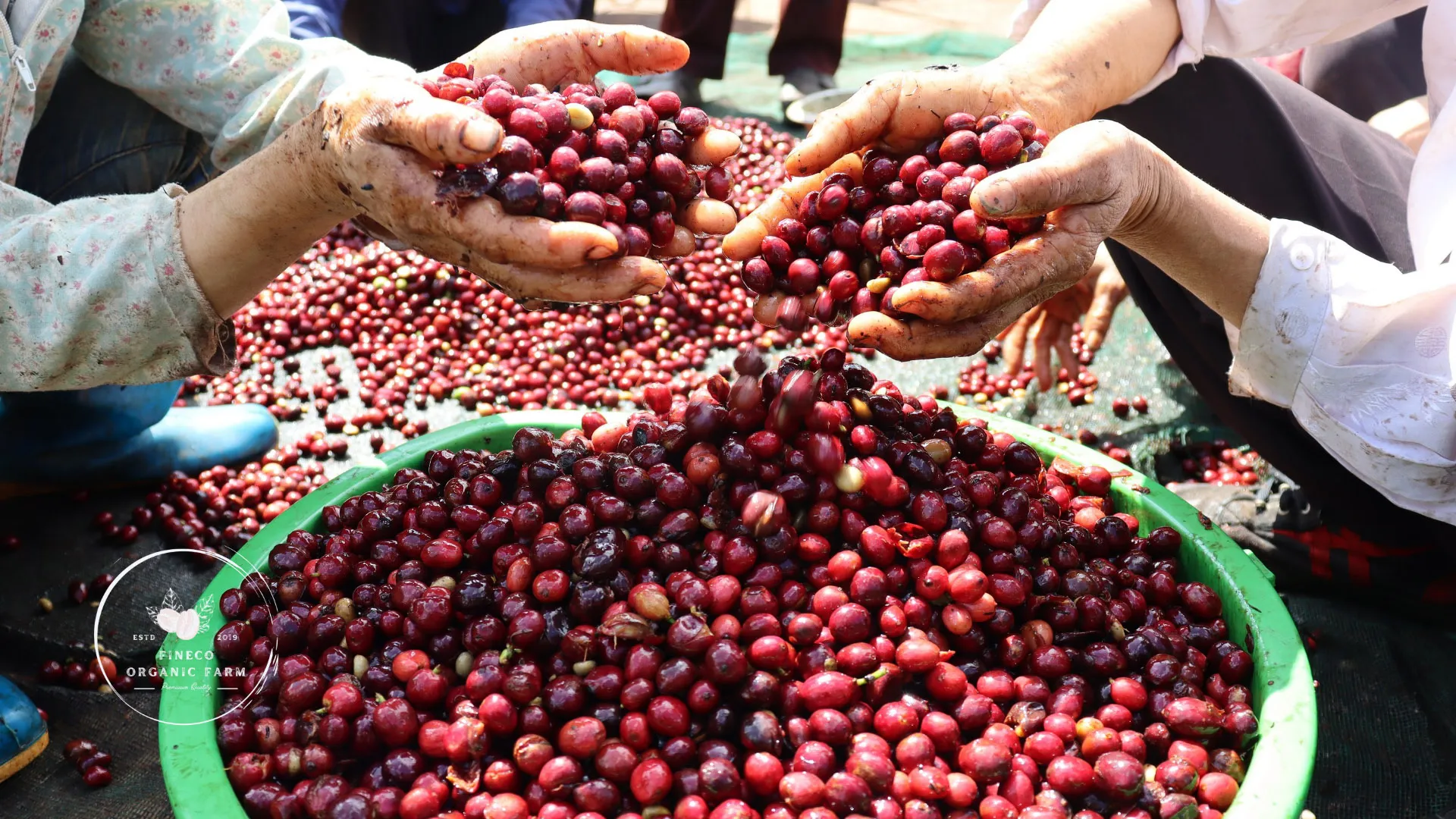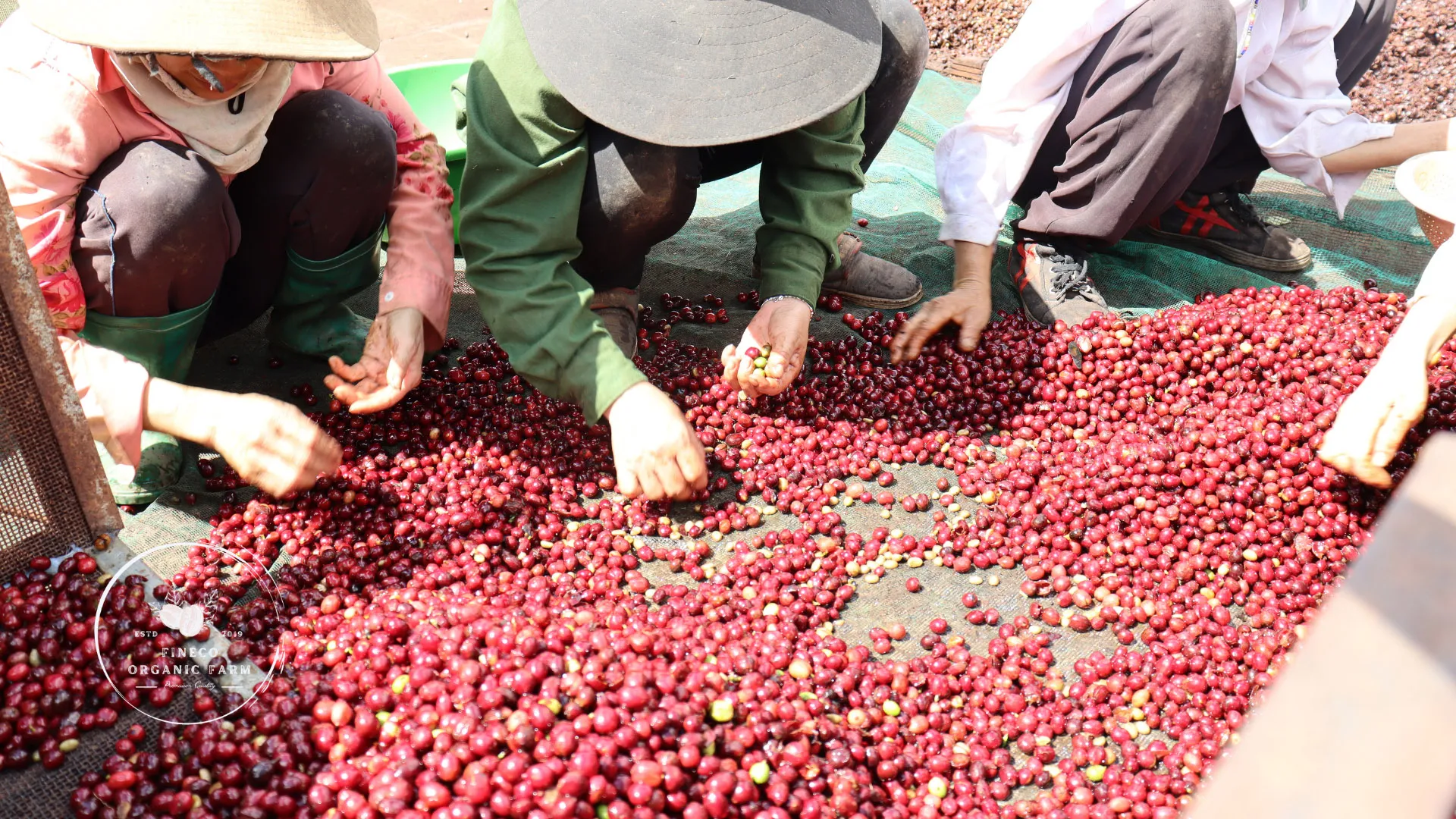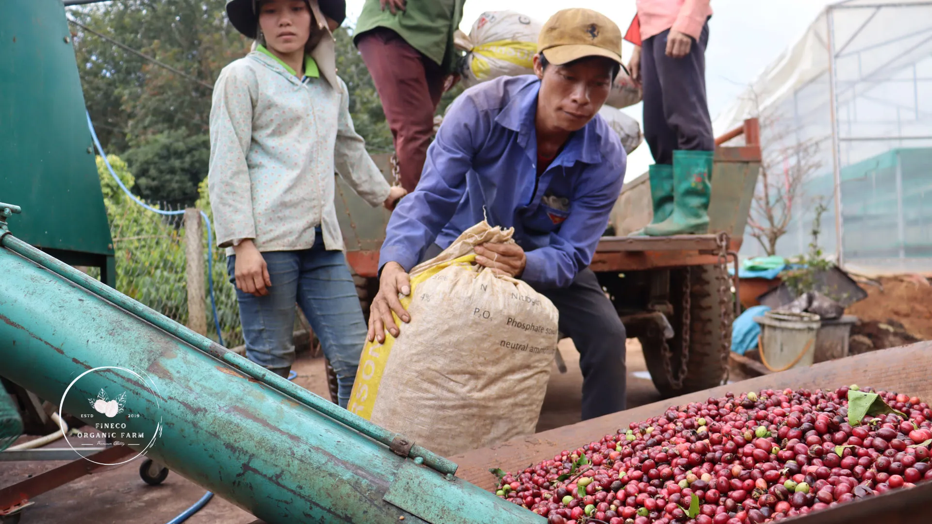 – Thu hái:hạt cà phê được thu hái thủ công bằng tay khi trái cà phê đạt độ chín tối thiểu 90 – 95%.Cà phê sau khi được thu hái từ nông hộ sẽ được chuyển đến nhà sơ chế, nơi có thể kiểm soát ổn định nhiệt độ và độ ẩm trong vòng 24h.