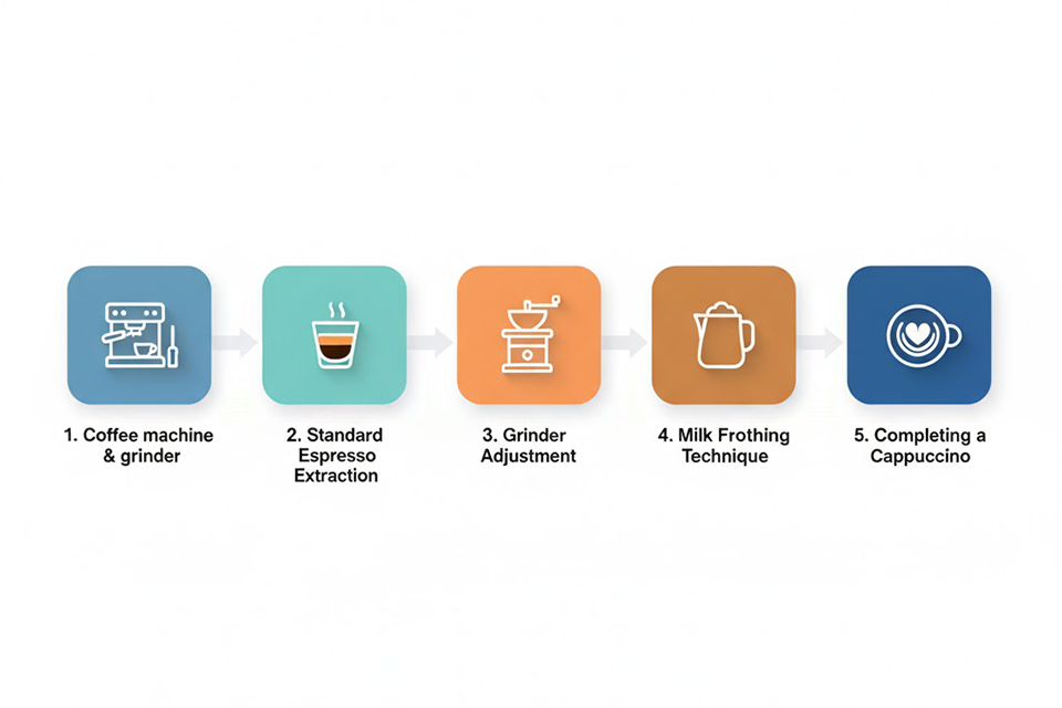 Chương trình được xây dựng theo một lộ trình 5 bước thực chiến, đi từ nền tảng thiết bị đến kỹ năng hoàn thiện một tách Cappuccino.